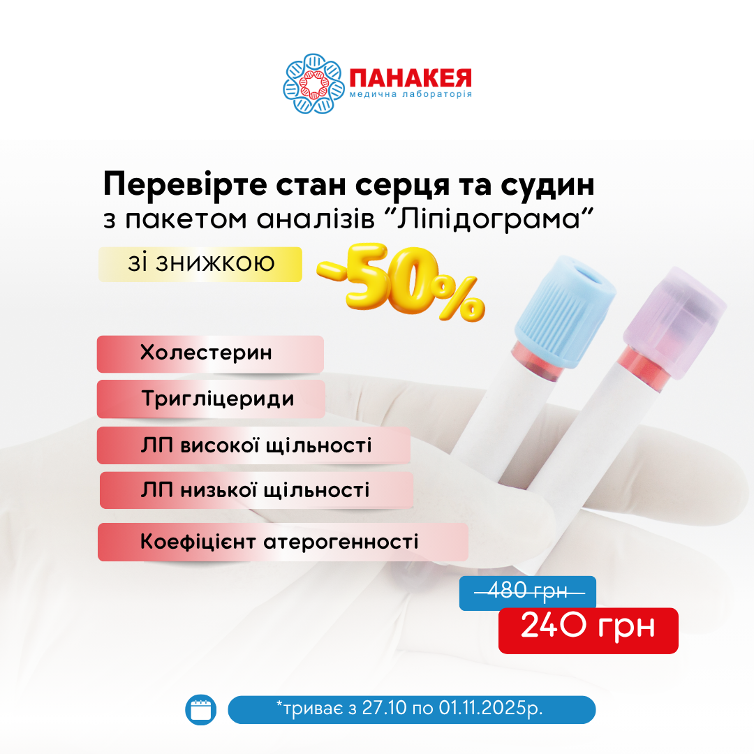 Пропонуємо Вам скористатись пропозицією та визначити показники ліпідограми зі знижкою у -50%:
