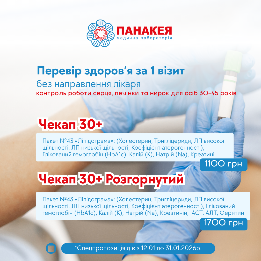 *соціальна ініціатива діє з 12.01 по 31.01.2026р. у всіх відділеннях мережі медичної лабораторії “Панакея”. Акція не сумується з іншими пропозиціями і знижками.